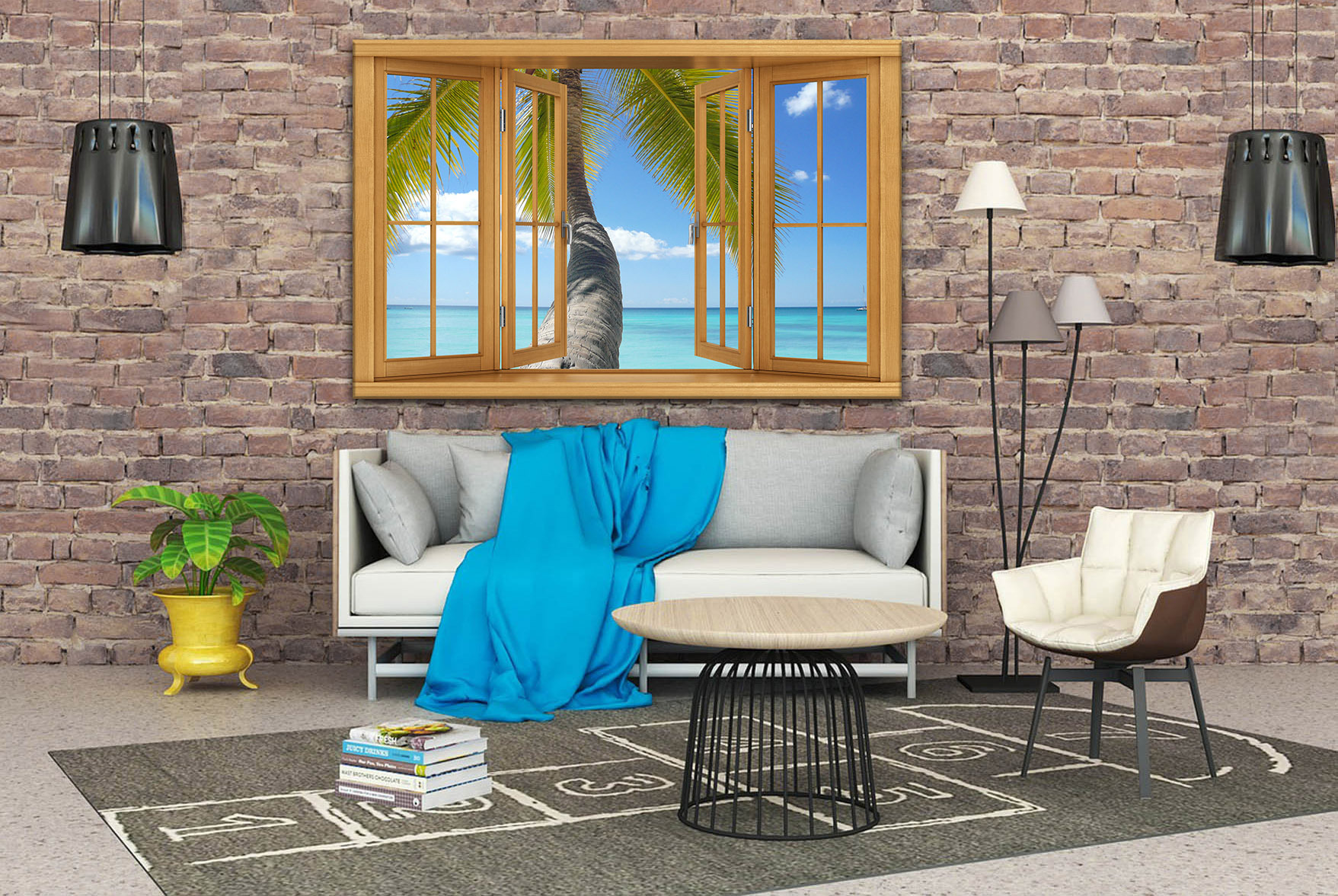 Produktinformationen "Leinwandbild Wandbild Fensterblick Meer Palmen Paradise"
