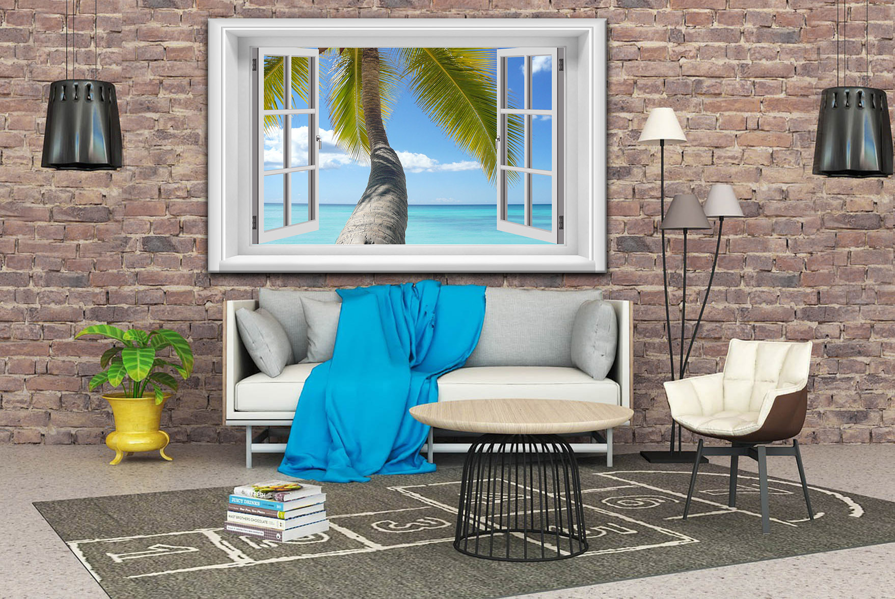 Produktinformationen "Leinwandbild Wandbild Fensterblick Meer Palmen Paradise"
