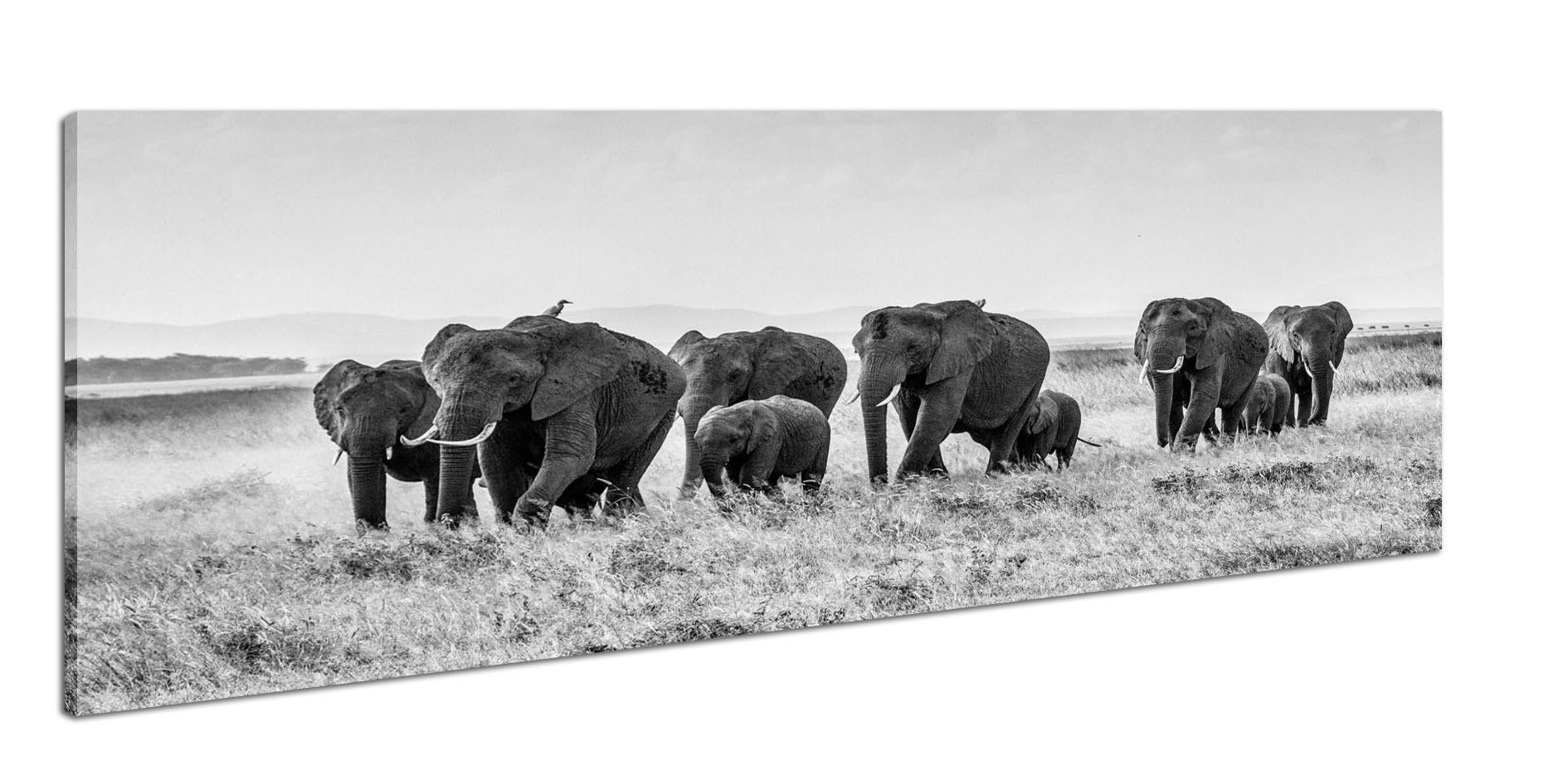 Weiterführende Links zu "Leinwandbild Wandbild Panorama Afrika Safari Elefanten Schwarzweiß"